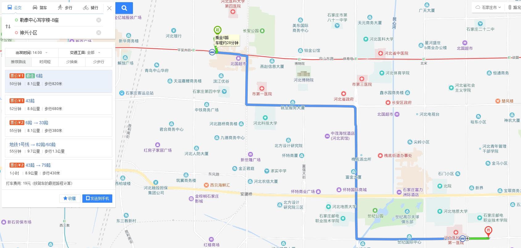 我们在勒泰中心出发,在北国商城站乘坐6路公交车,到达终点站医大一院站,向东步行约500米到达小区。