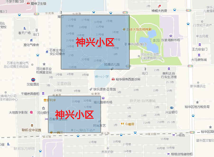 神兴小区分为南北两个部分,北区以多层板楼住宅和多层塔楼为主,南区则以板楼洋房为主,小区共有39栋楼,1656户。北区的楼龄较老,楼栋的外立面较旧,南区则明显较好。