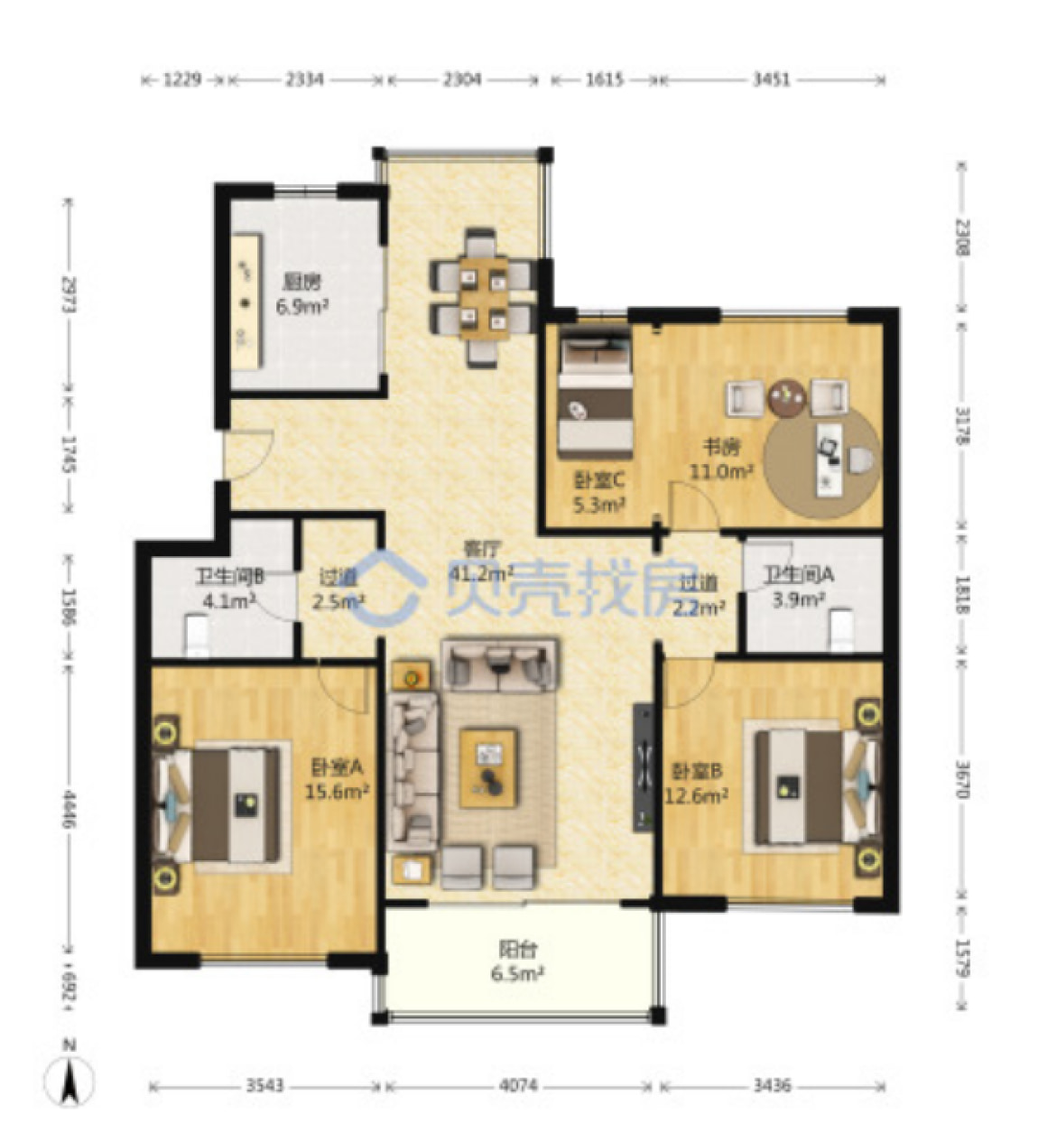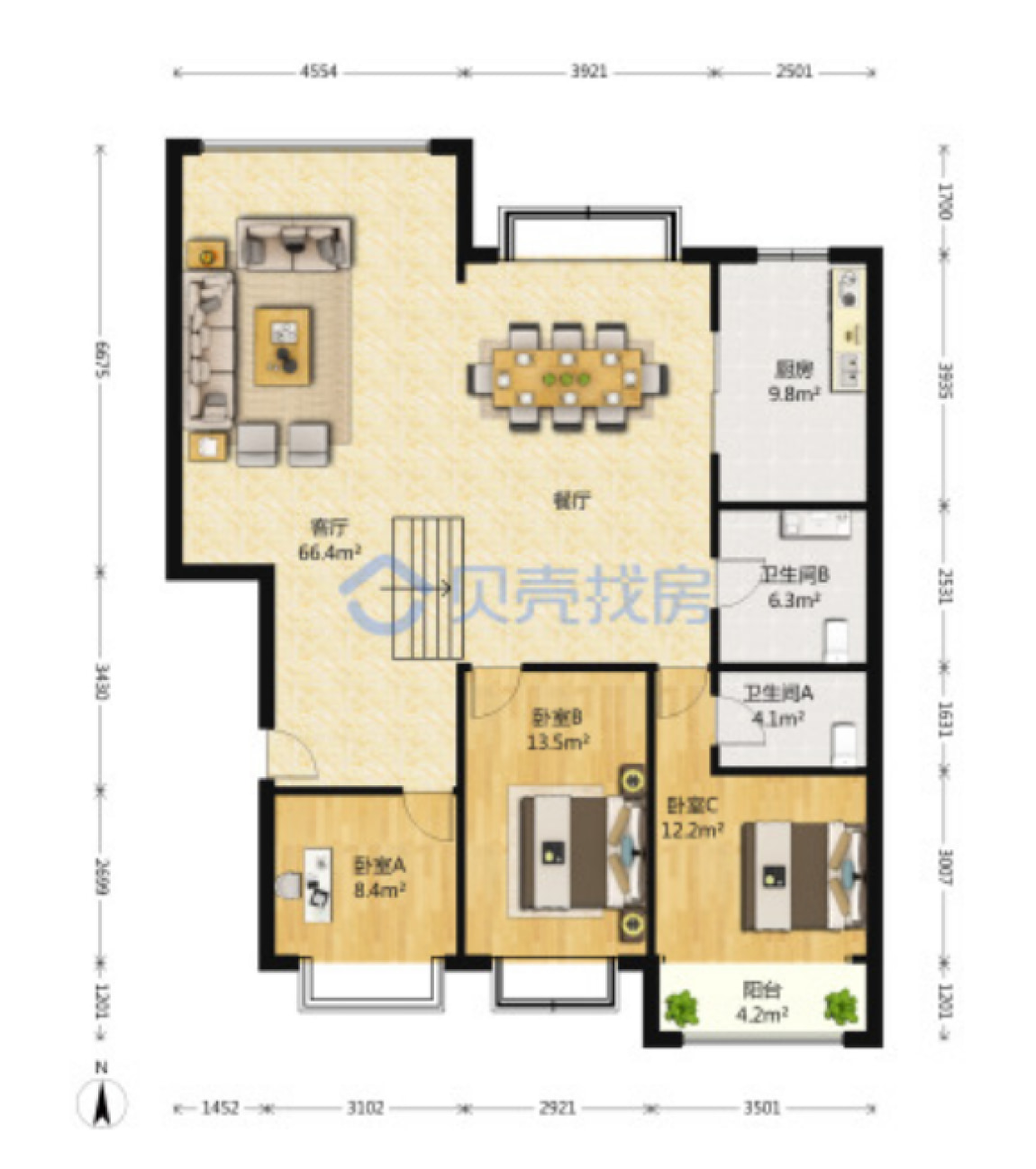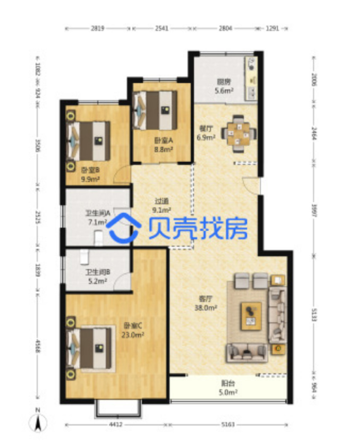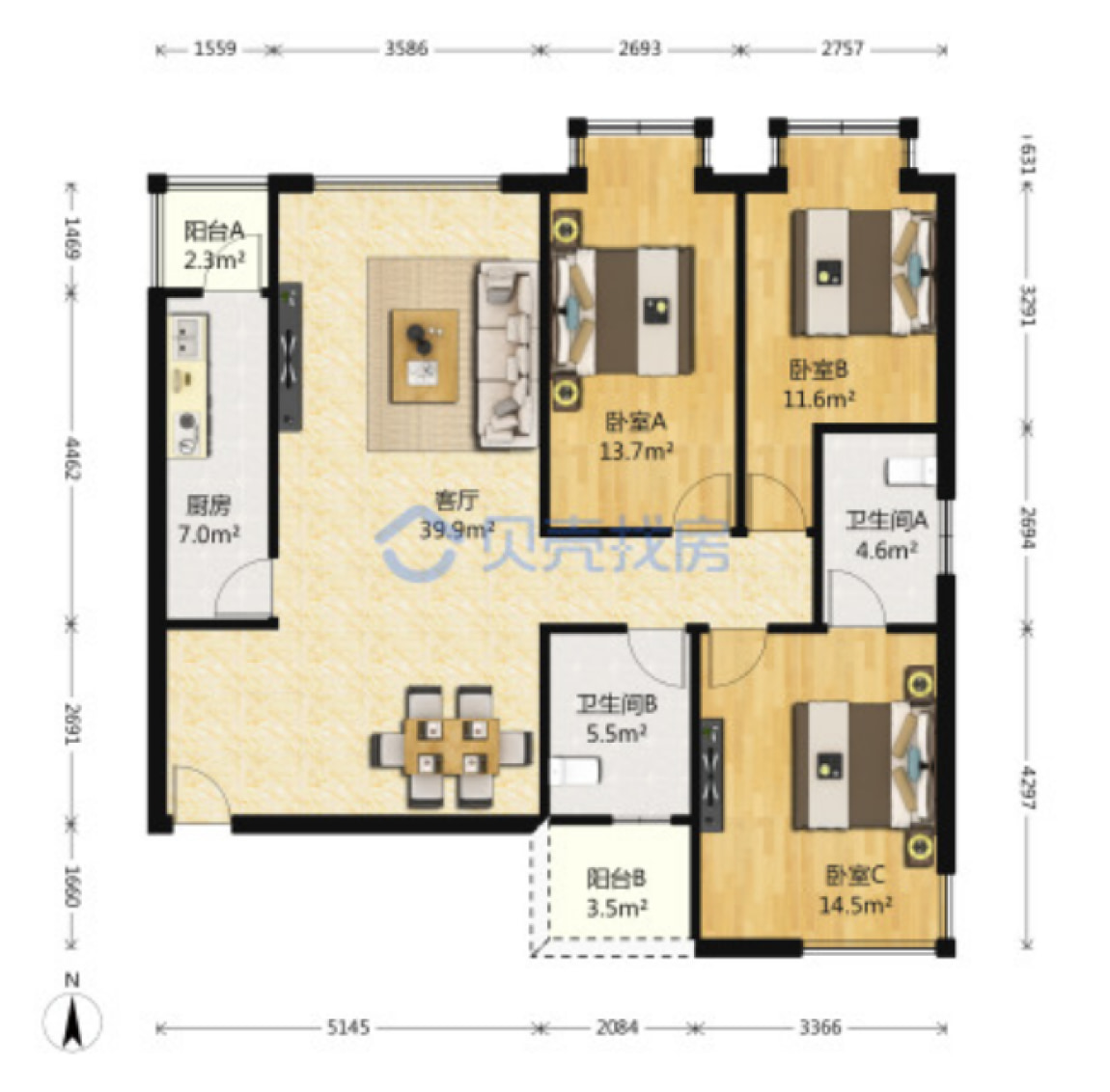 房子满五唯一,户型方正,采用了现代错层设,室内空间宽敞。南北通透,三南卧北厅,客厅带半落地阳台,采光效果佳。