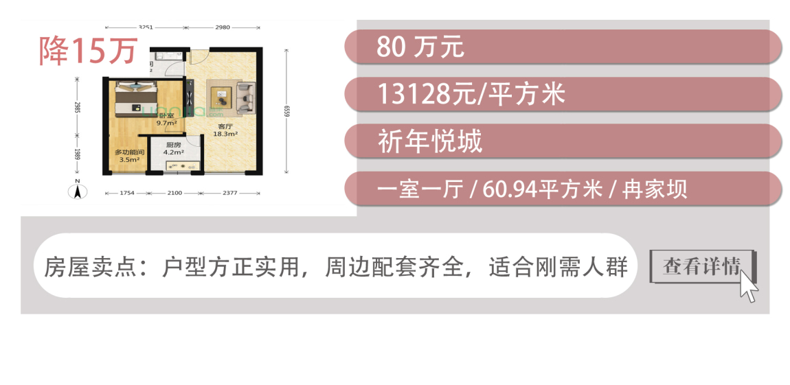 在本期13套降价房中,降价15万元及以上房源达6套,降幅显著。其中一套位于渝北冉家坝的房源总价仅售80万元,户型方正紧凑,功能性强,客厅面积大,小区距离轻轨六号线冉家坝站仅294米,距离爱融荟城约321米,生活配套齐全,适合刚需上班族。