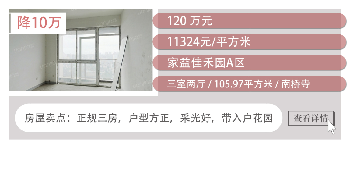 另外,江北区南桥寺有一套正规3房户型,总价为120万元,直降10万元,值得关注。此房南北通透,采光好,带5.6平方米的入户花园,客厅面积大,功能划分合理,品质较高,适合三代同堂家庭居住。