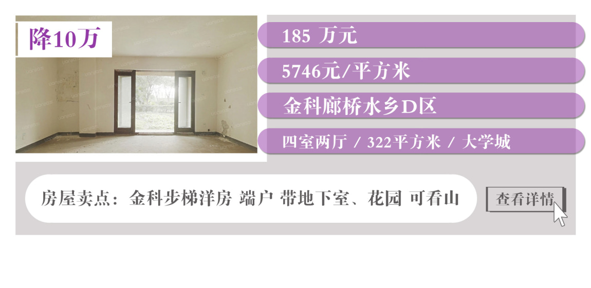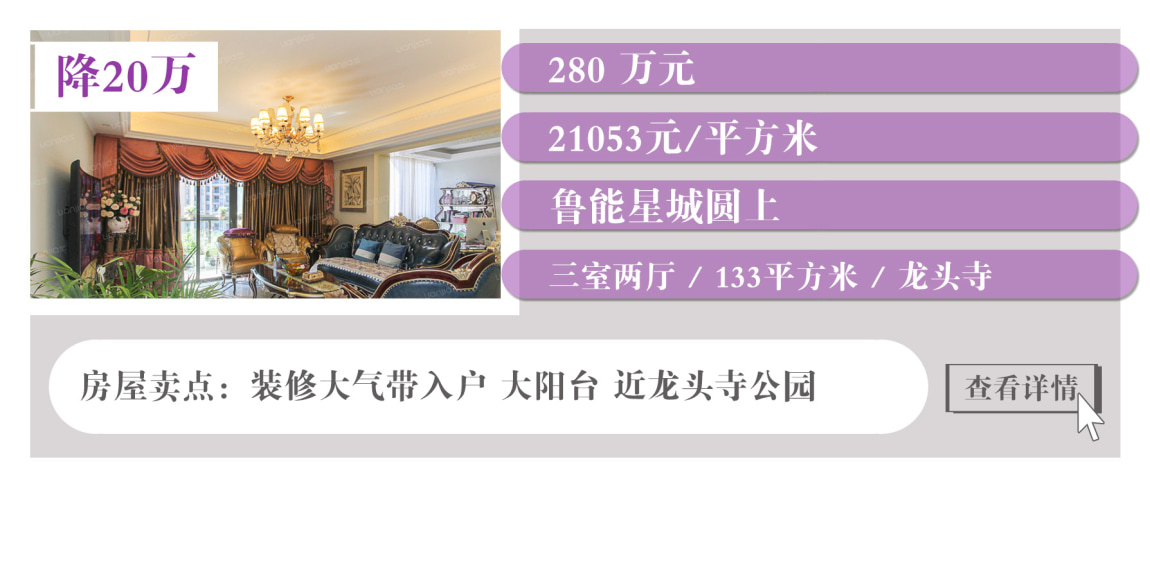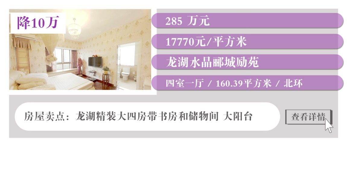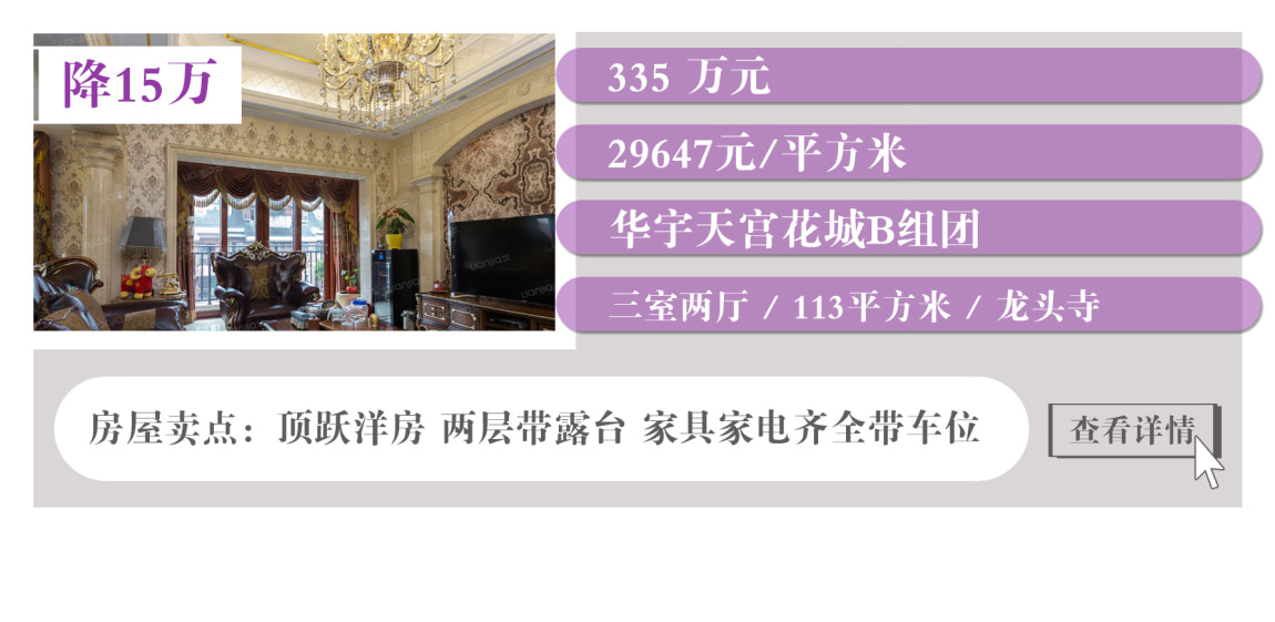 从上表中房源单价来看,单价较低的是大学城金科廊桥水乡D区的清水大四房,步梯洋房带花园,单价5字头起;价格较高的是龙头寺华宇天宫花城B组团的精装大三房,顶跃洋房,两层带露台,单价约三万元。