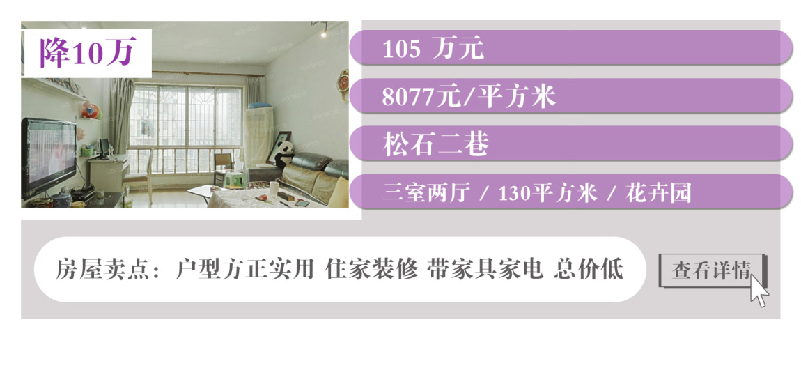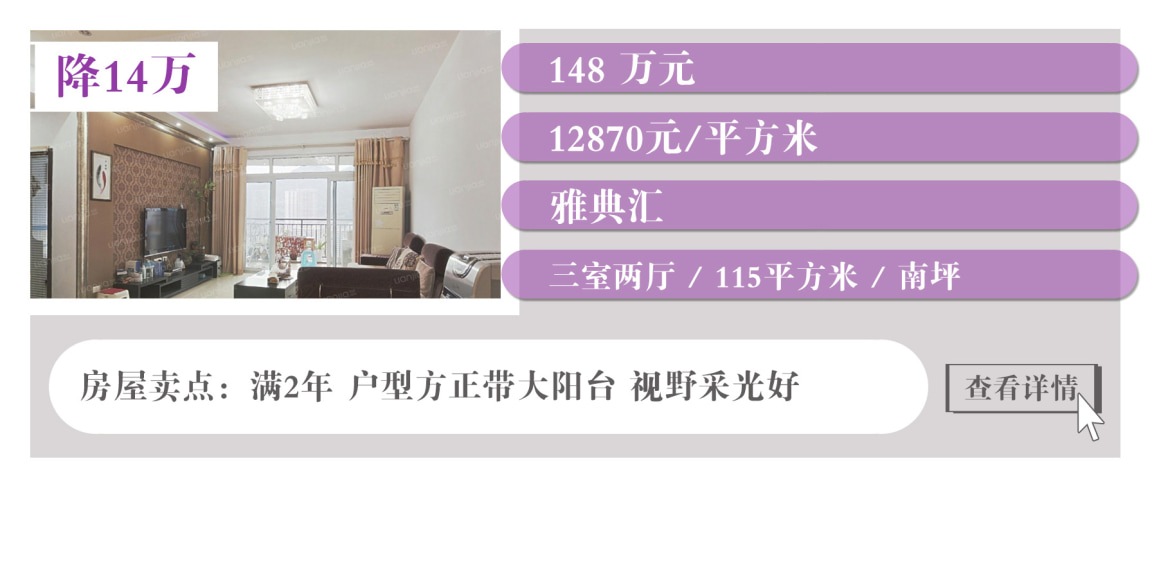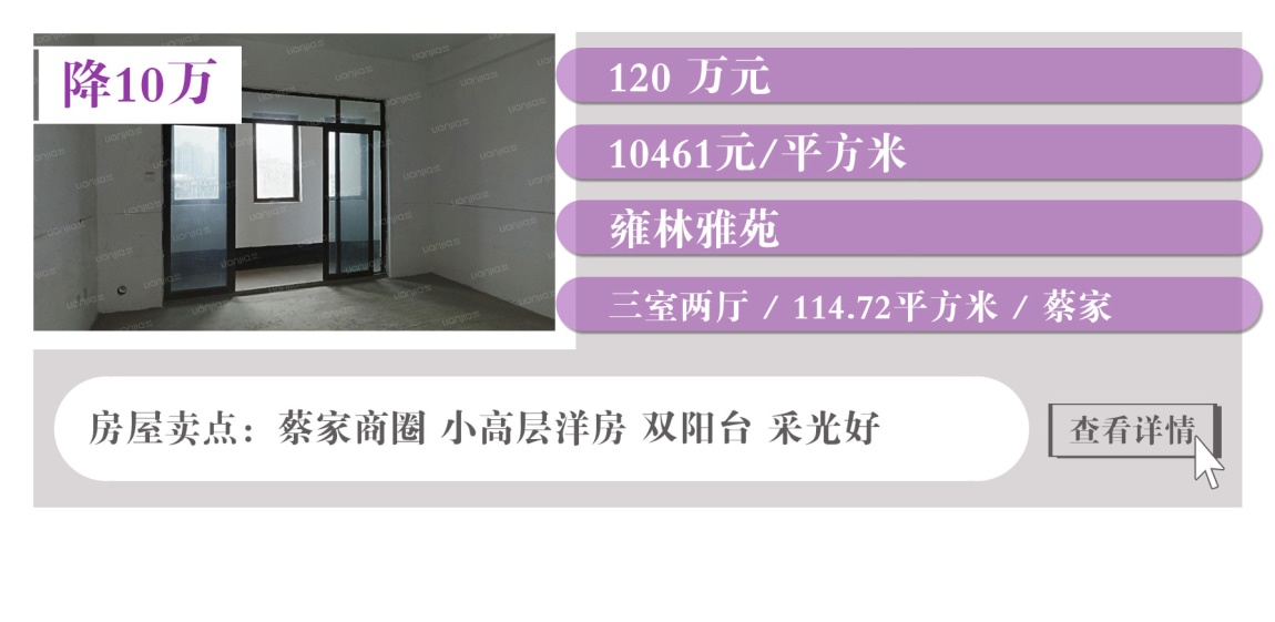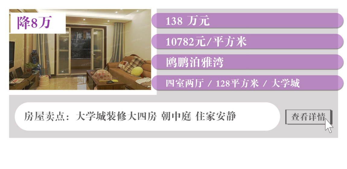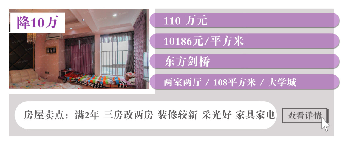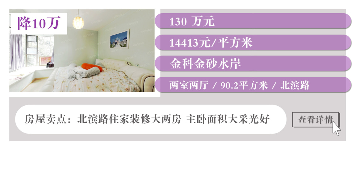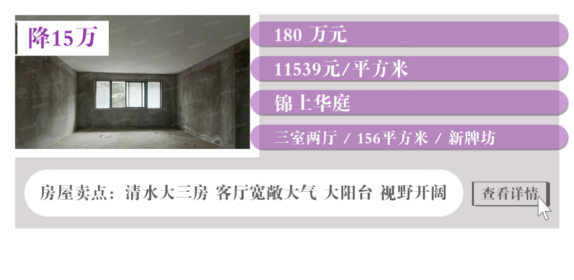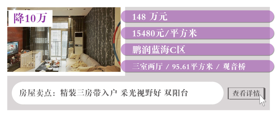 上表中沙坪坝有3套降价房,都集中在大学城,户型面积大,居住舒适度高。此外,江北有两套降价房,蔡家也有一套降价房。