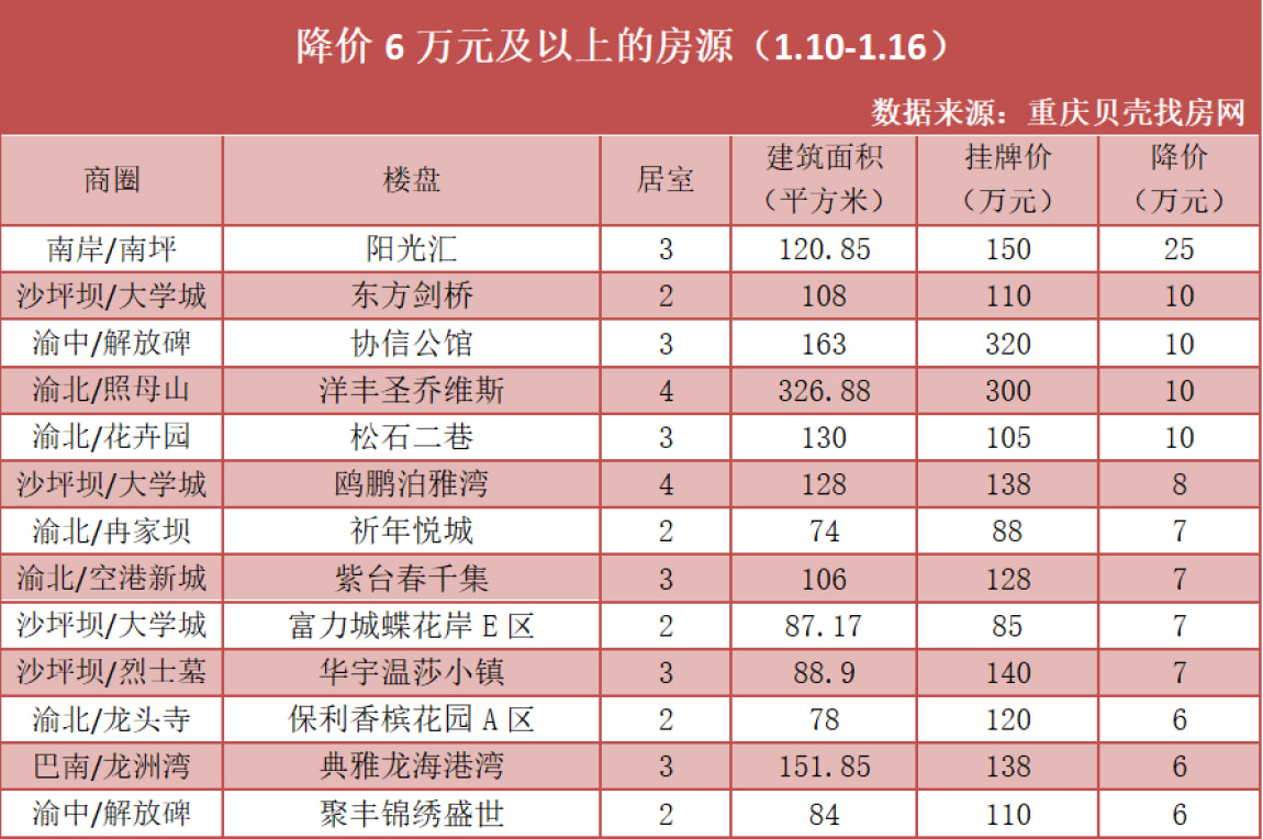 我们聚焦1月10日—1月16日降价超6万元的房源,最高直降25万元,涵盖主城五大区域,赶紧来“盘”一“盘”~