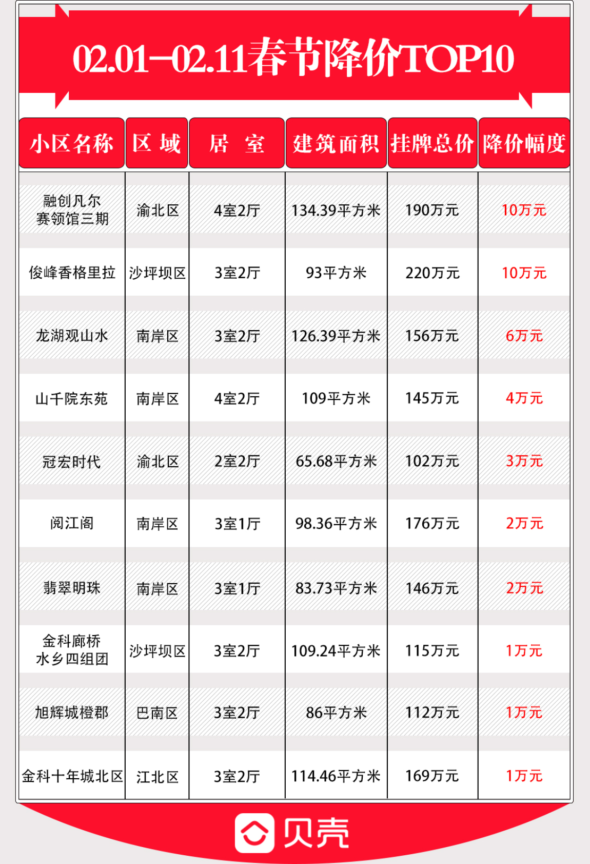 本期我们根据重庆贝壳找房网春节期间(2.1-2.11)的数据,为大家筛选了降幅最高的10套房源,用实惠“治好”你的“假期后遗症”。