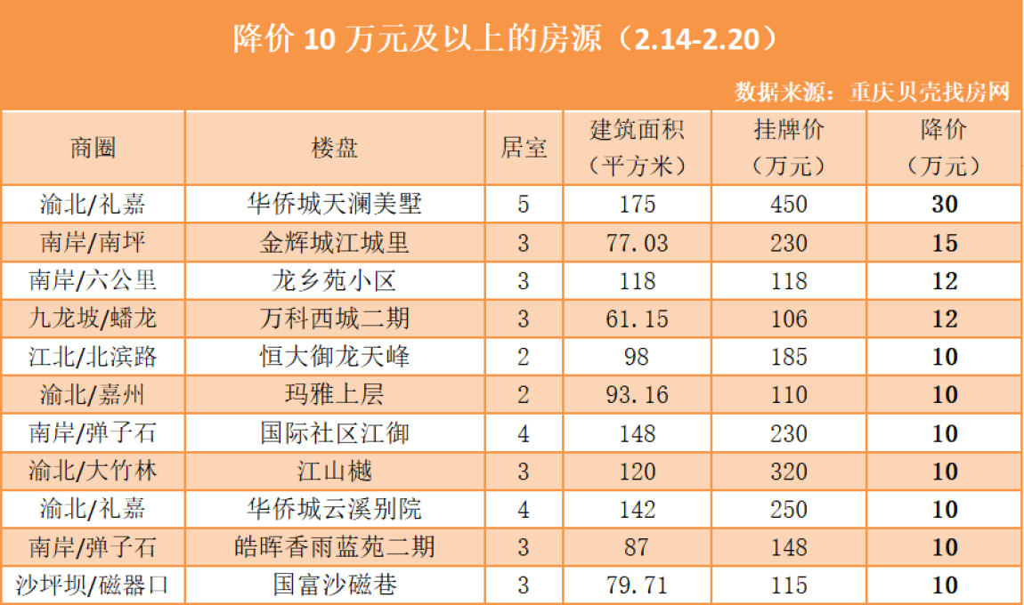 从上表来看,本周高降幅房源分布在渝北、江北、沙坪坝、九龙坡、南岸5个区域,以3房户型为主,最大户型为5房,最小户型为2房。