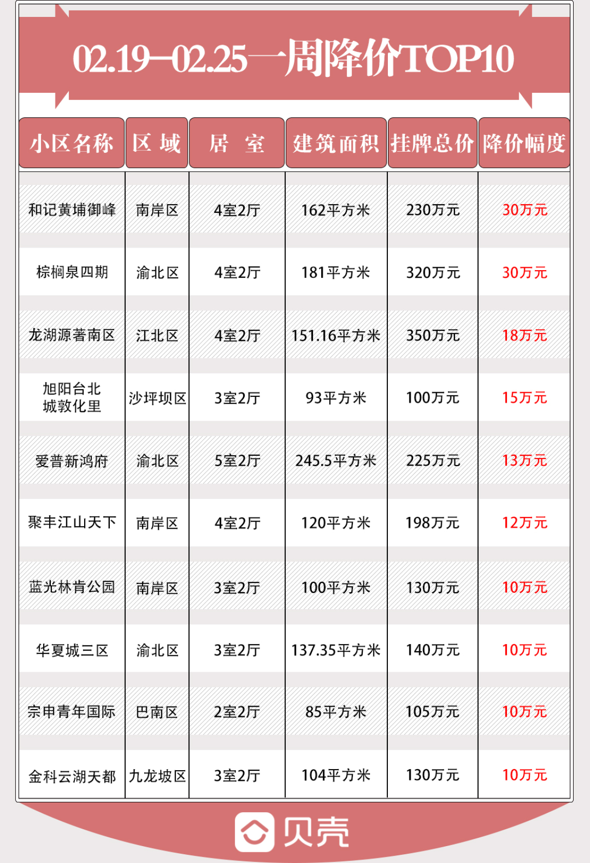 我们根据重庆贝壳找房网(2.19-2.25)的业主调价数据,为大家筛选了降幅最高的10套“趴活”房源,最高直降30万元,别嘴硬了,赶紧捞起来~