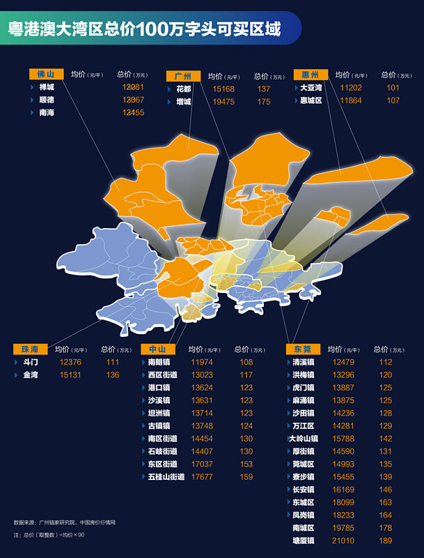 总价100万字头可以买到的区域也是34个。进入这个价格范围,热门城市广州的郊区增城、花都已经可以买到,还有佛山的禅城、南海、顺德,以及惠州、中山、珠海、东莞等正在崛起的新兴区域也可入手!