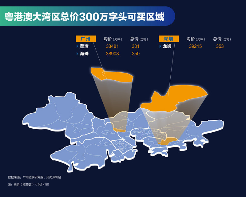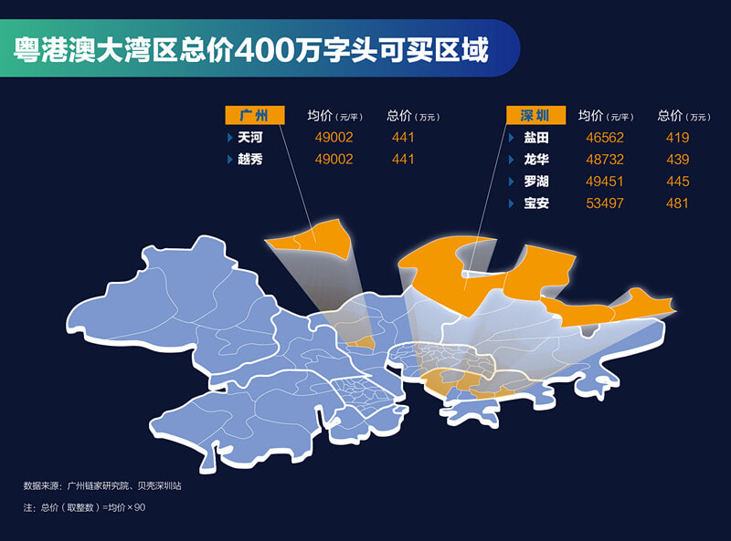 不出意料,在300万字头至400万字头里“存活”的就是大湾区内的两大一线城市。无论是广州老城区代表越秀、海珠、荔湾以及新市区选手天河,还是深圳龙岗、龙华、盐田、罗湖、宝安都有大把选择。