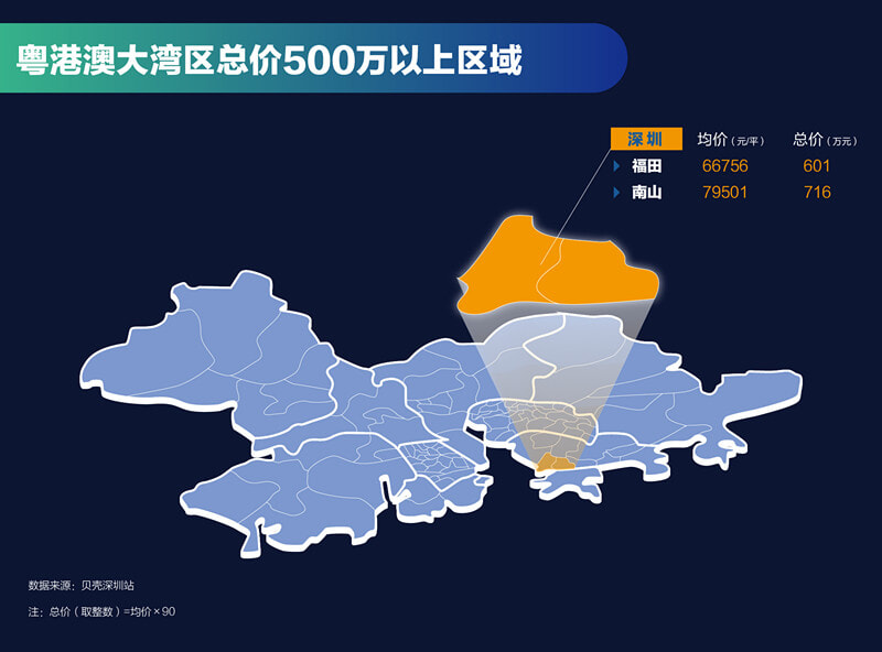 整个粤港澳大湾区,在房价这方面,如果深圳认第二,绝不会有人敢认第一。85个行政区中,仅有来自深圳的福田、南山攀上了500万以上的高峰,其中南山总价甚至高达716万!