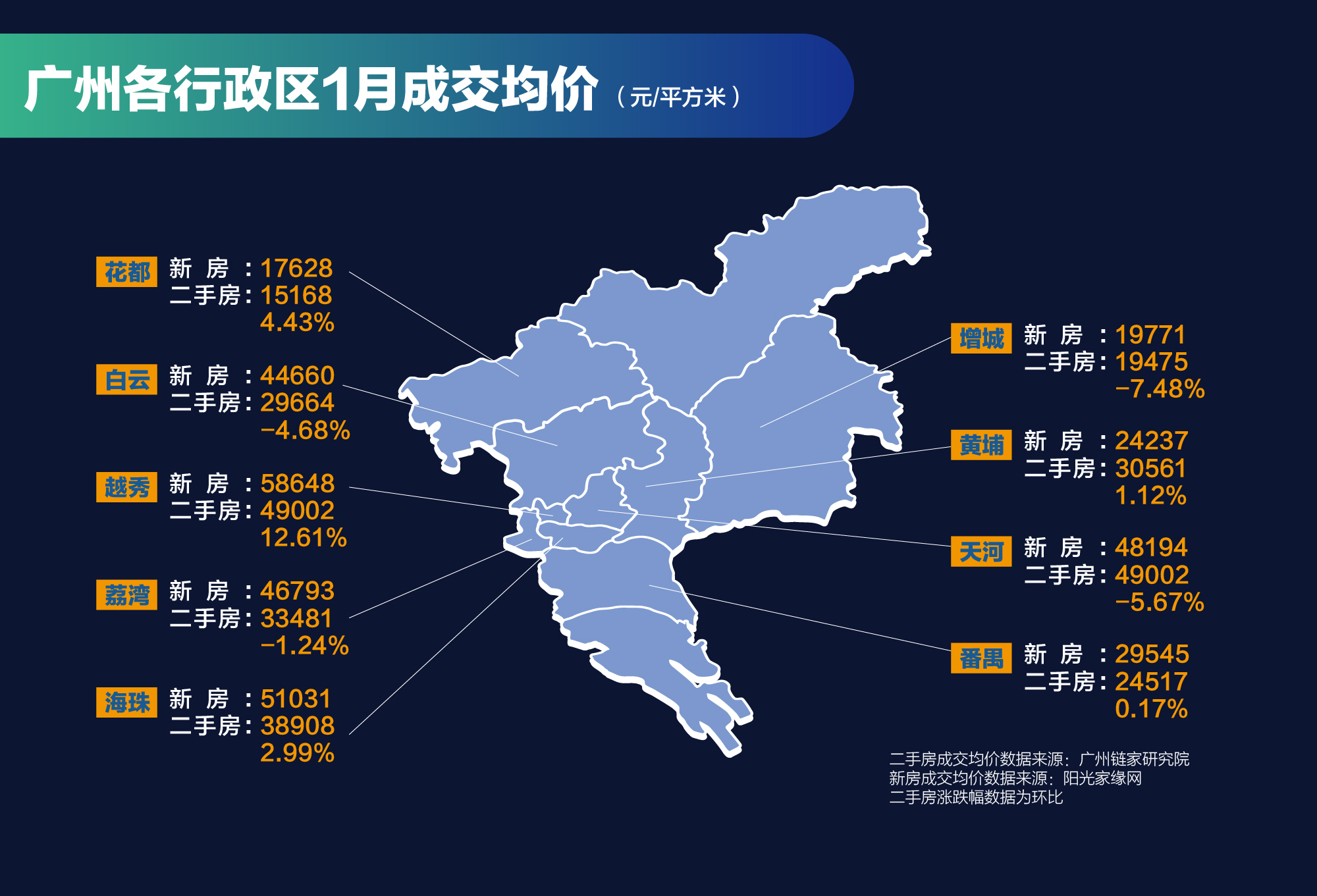 从其1月二手房成交均价来看(除从化、南沙外),花都仍是价格较低的地方,约1.5万/平。自花都2017年12月开通地铁9号线后,价格方面整体呈上涨状。