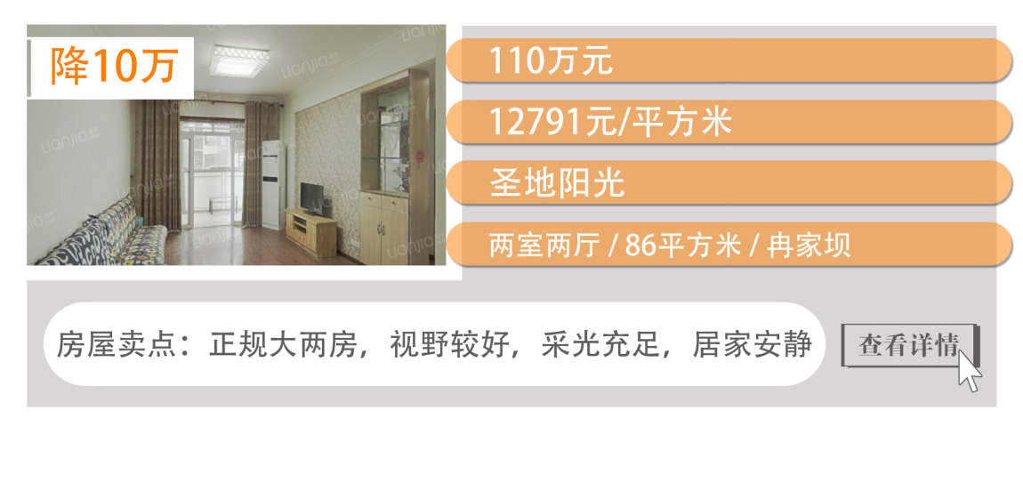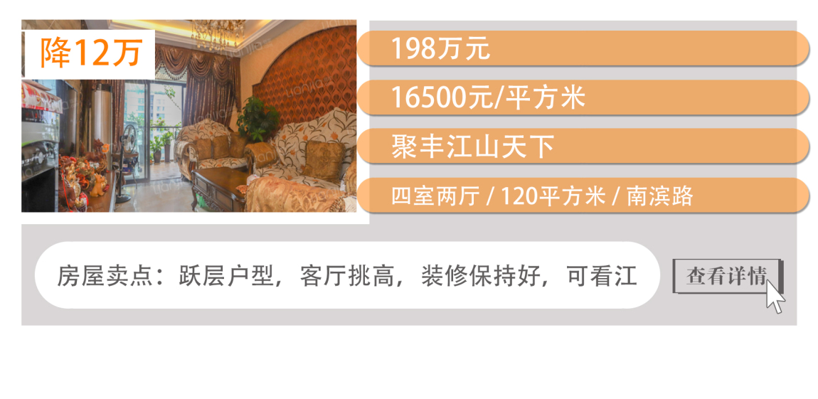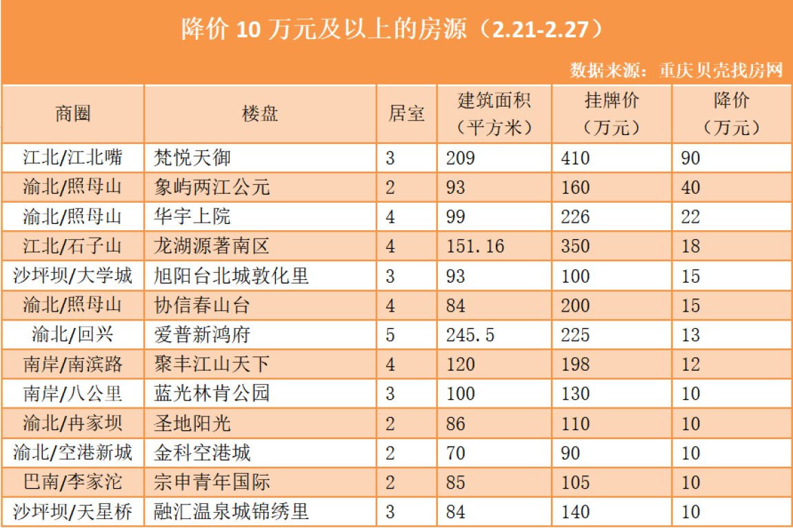 从上表来看,本周高降幅房源分布在渝北、江北、沙坪坝、巴南、南岸5个区域,大小户型均有,最大户型为5房,最小户型为2房。