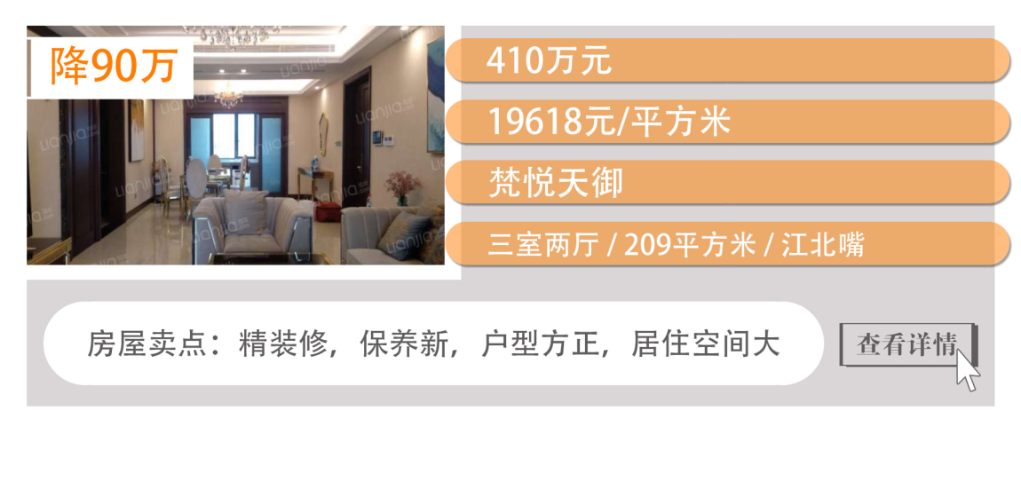 最高降价达90万元的房源位于江北区江北嘴,梵悦天御小区。