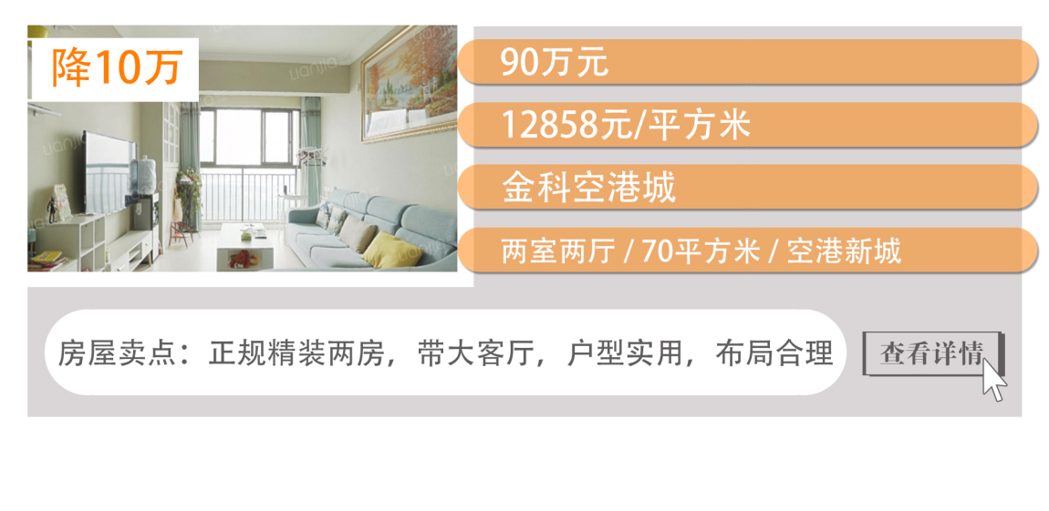 其中,有一套2房户型值得关注,总价仅90万元,直降10万元。该房为2室2厅户型,精装修,客厅面积达30.1平方米,有居住空间。小区位于渝北空港新城,距离轻轨三号线观月路站约934米,出行方便。