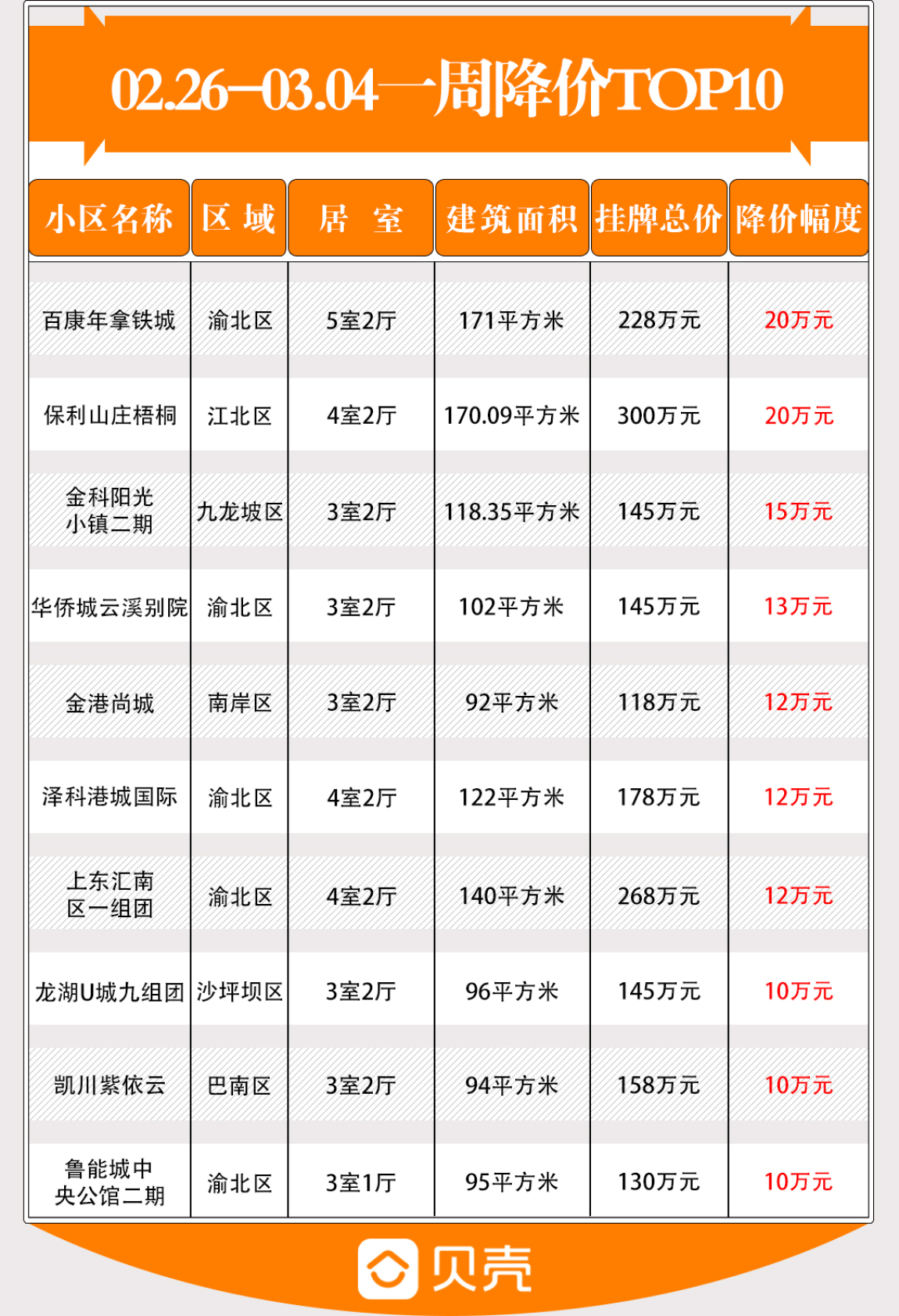 我们根据重庆贝壳找房网(2.26-3.4)的业主调价数据,为大家筛选了降幅最高的10套“真香”房源,最高直降20万元,别“酸”了,赶紧看起来~